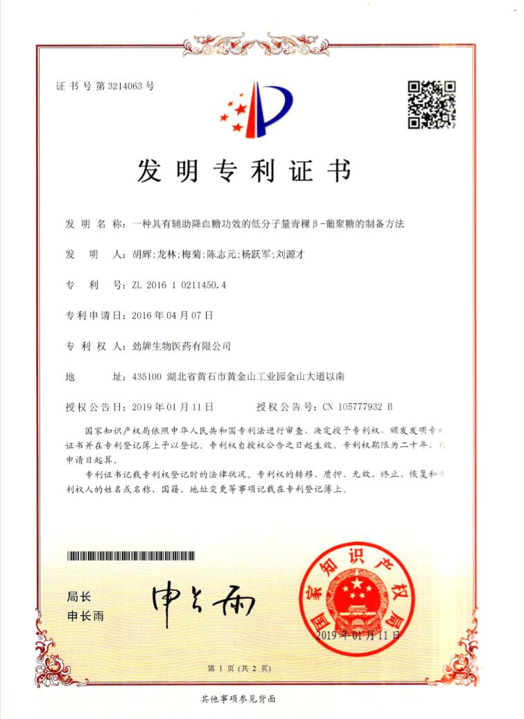 1月11日,由胡輝、龍林、梅菊、陳志元、楊躍軍、劉源才6人提出的《一種具有輔助降血糖功效的低分子量青稞β-葡聚糖的制備方法》獲得發(fā)明專利。該專利為勁牌公司2019年自然年度獲批的第一項發(fā)明專利。